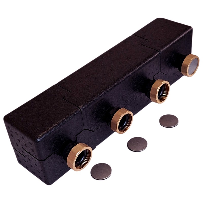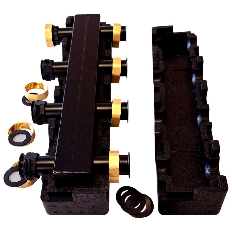 Collettore di distribuzione - per gruppi di rilancio che consente il collegamento di 3 gruppi di rilancio | 1 o 2 fonti di calore. In alternativa, è possibile collegare un terzo circuito di uscita e una fonte di calore. Il sistema ha una distanza standard tra i raccordi di 125 mm, che lo rende compatibile con la maggior parte dei gruppi di rilancio disponibili sul mercato. Il collettore distributore 2-4 è il complemento ideale per i gruppi di rilancio nel nostro negozio.