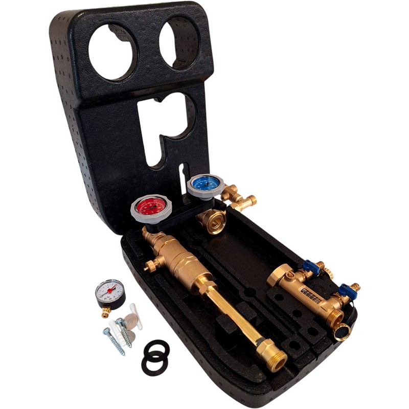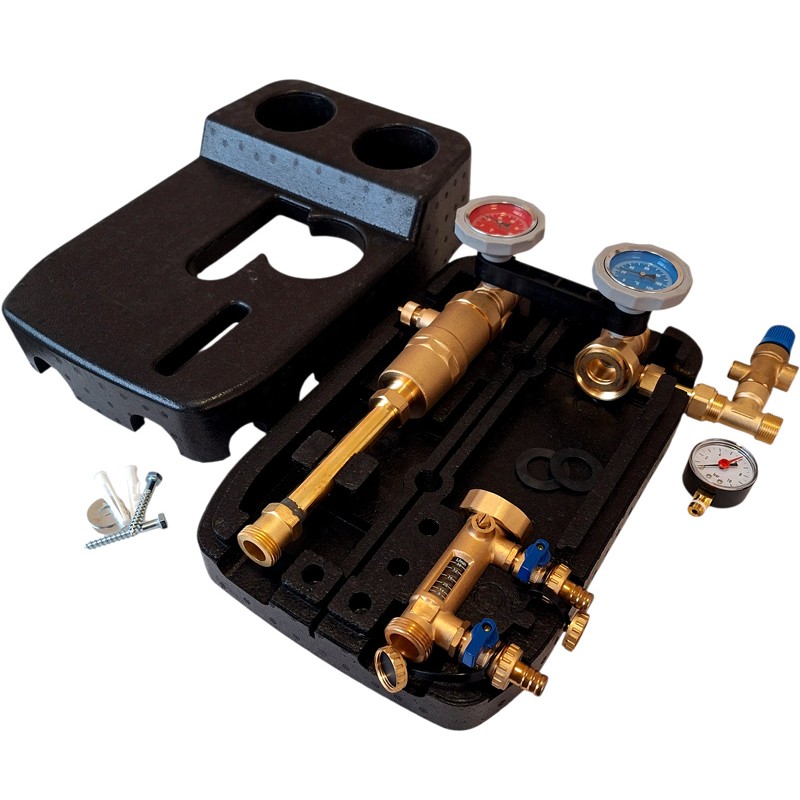 - è solitamente composto da due valvole di intercettazione, alloggiamento per la pompa di circolazione, rotametro, valvola di sicurezza, manometro e separatore d'aria