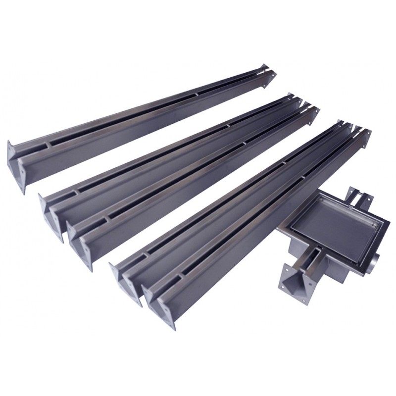 Ogni set di drenaggio lineare industriale di questa offerta comprende la griglia di scarico, ovvero l’elemento principale con sifone. Insieme alle connessioni per i bracci, cioè le canalette che raccolgono l’acqua, misura 35 cm – cosa da considerare nella pianificazione dell’acquisto e del montaggio. È l’elemento di scarico che si collega alla rete fognaria e dispone di uscita dell’acqua in dimensione DN50, visibile nelle foto.