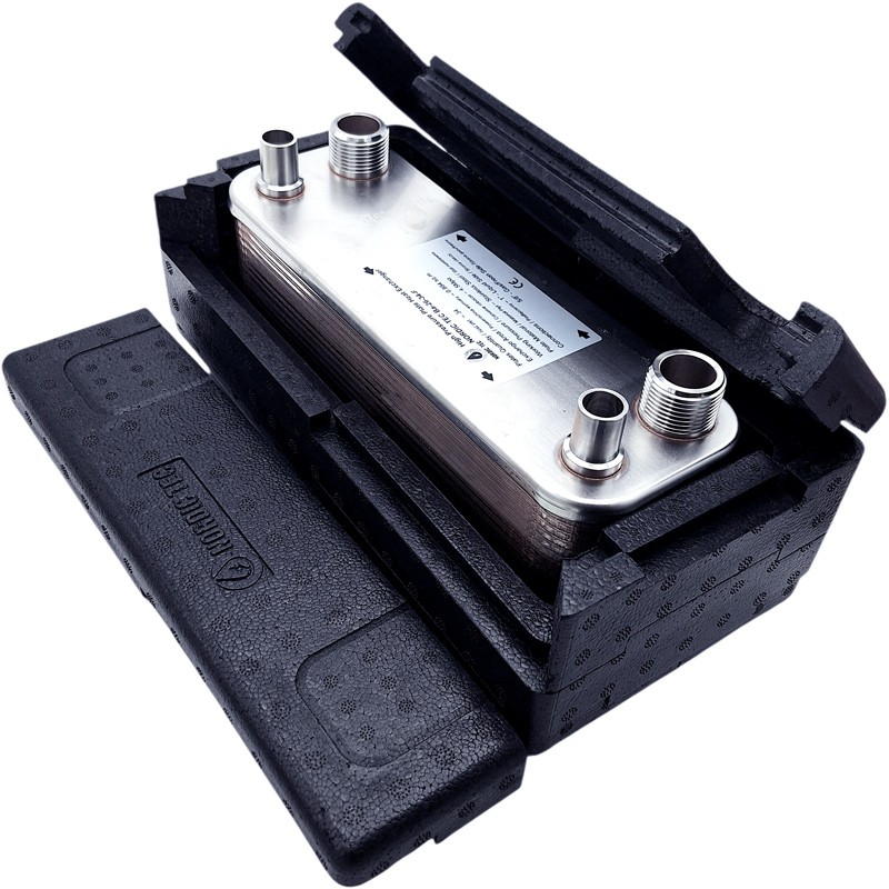 Lo scambiatore di calore per freon a 34 piastre è disponibile opzionalmente anche con isolamento, che aumenta l'efficienza del trasferimento di calore riducendo la dispersione termica all'esterno del dispositivo. È possibile verificare le varianti con o senza isolamento nel menu sopra il prezzo del prodotto.