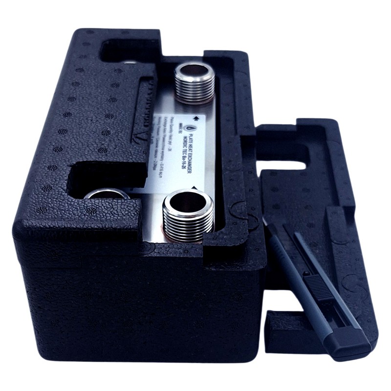 Scambiatore di calore da 105 kW - potenza nominale (per parametri elevati, quindi effettivamente raggiungibile solo in condizioni industriali). Scambiatore a 26 piastre, con possibilità opzionale di acquisto con isolamento e sospensione (supporto di montaggio per scambiatori da 1 pollice).