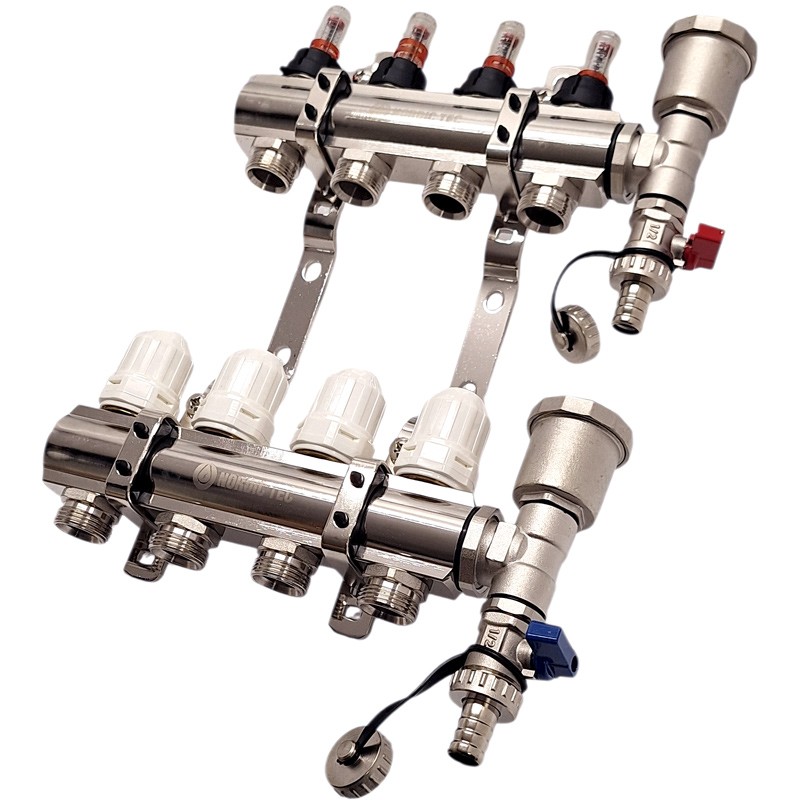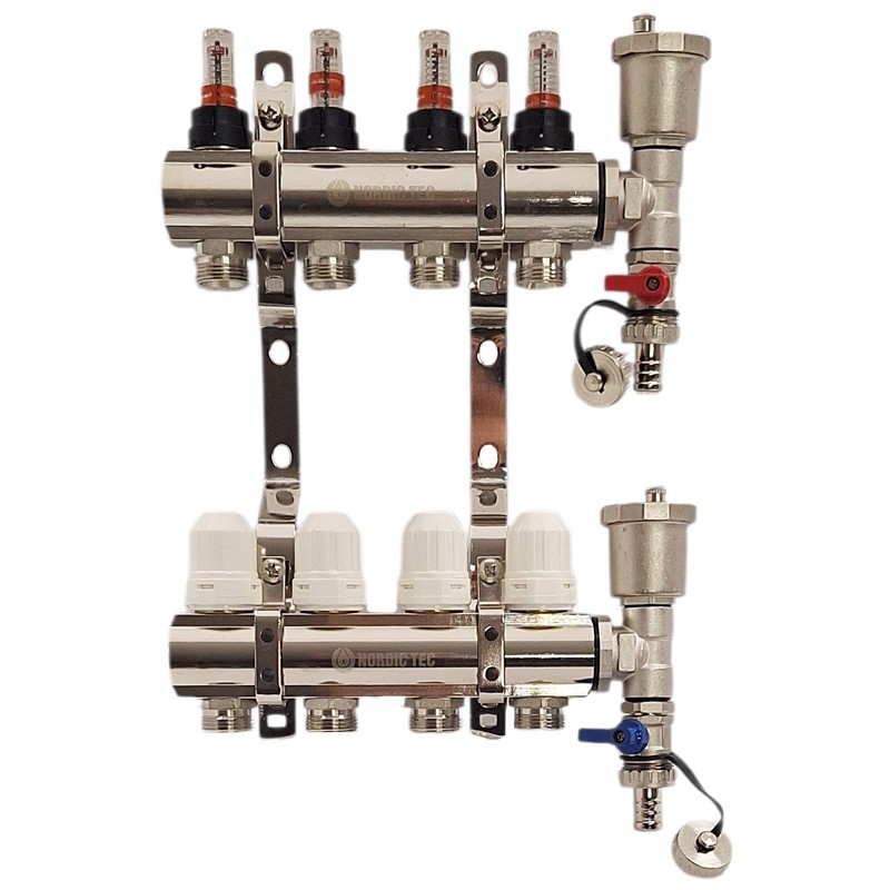 Un accessorio molto importante per un collettore a 4 circuiti, sia per impianti a pavimento che per radiatori, è la valvola di sfiato, che impedisce la formazione di bolle d'aria nel sistema, causando ostruzioni nei condotti e una minore capacità di flusso, con il risultato di circuiti di riscaldamento o stanze meno riscaldate. Nei nostri set di collettori per impianti a pavimento, inclusi anche quelli a 4 circuiti sopracitati, li forniamo sempre in forma di sfiato automatico, quindi non sarà necessario monitorare il processo di sfiato.