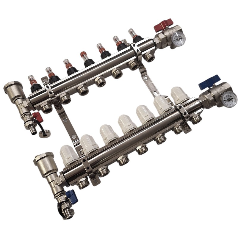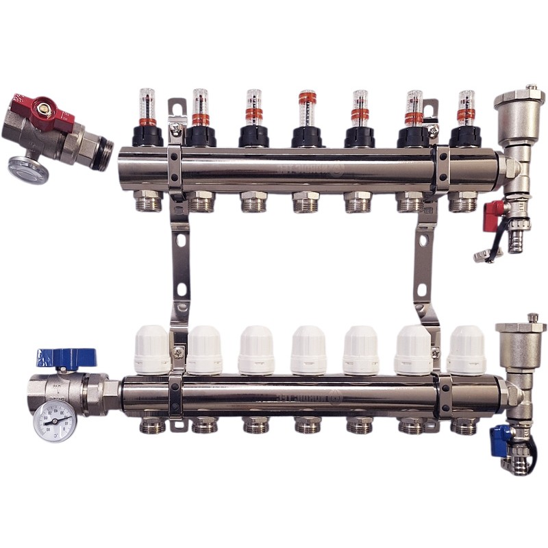 Collettore per riscaldamento a pavimento con 7 circuiti, completamente attrezzato con tutte le parti e gli accessori necessari, che consente il collegamento di 7 sezioni dell’impianto di riscaldamento centralizzato. Tutto in un’unica confezione, senza la necessità di cercare o acquistare ulteriori componenti separatamente. Questo significa un risparmio di tempo e denaro: il collettore a 7 circuiti arriva già assemblato per quanto riguarda i misuratori di flusso e le valvole. Basta solo decidere su quale lato installare le valvole di intercettazione e i termometri per il riscaldamento a pavimento, e su quale lato posizionare le valvole di sfiato e successivamente avvitarle. L’assemblaggio dell’intero kit richiede solo pochi minuti.