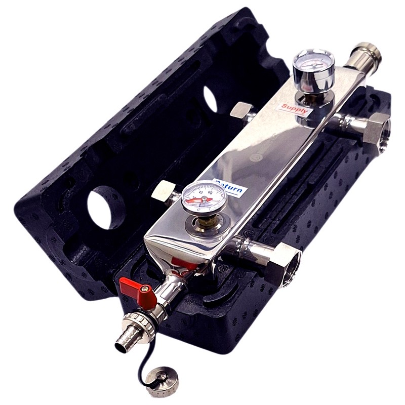 Il separatore per 2 circuiti di riscaldamento funge da distributore, controllando il flusso d'acqua e permettendo una distribuzione uniforme del calore nelle diverse parti del sistema. Il termometro integrato consente di monitorare in tempo reale la temperatura dell'acqua, permettendo un controllo preciso e un adattamento della potenza termica in base alle necessità.