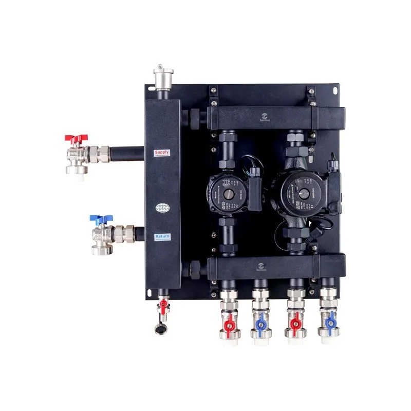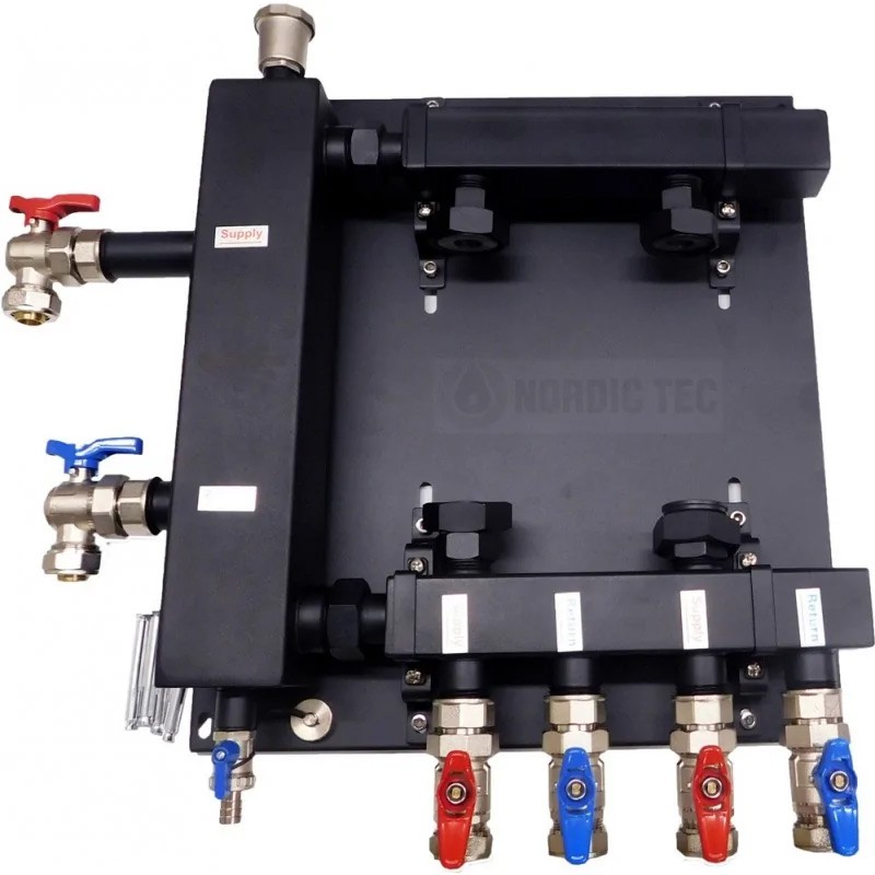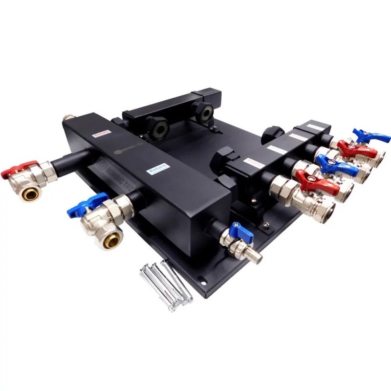 Il set separatore collegato al collettore / collettore di circuiti di riscaldamento funziona meglio rispetto al separatore tradizionale, poiché le travi del collettore rinforzano la funzione del separatore, creando una zona neutra per le pompe di circolazione.